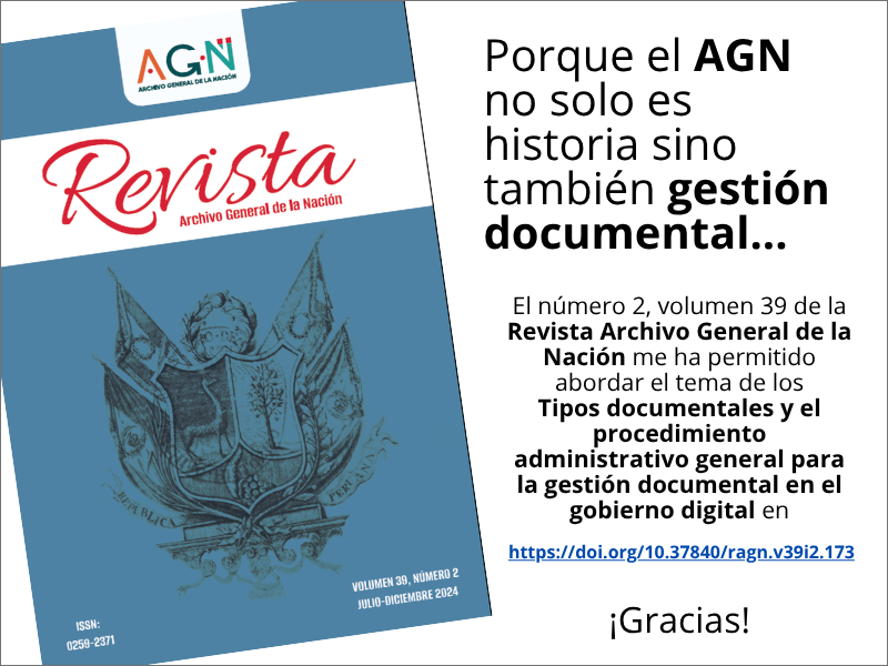 En esta edición el Archivo General de la Nación me ha honrado al publicar el artículo «Tipos documentales en el procedimiento administrativo general para la gestión documental en el gobierno digital», donde evidencio la necesidad de identificar los tipos documentales para garantizar la integridad de los expedientes electrónicos en el entorno digital.